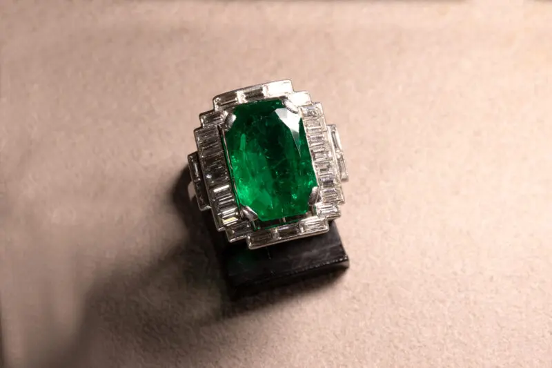 Importante bague en platine centrée d’une émeraude de Colombie rectangle à pans coupés facettée, dans son entourage de diamants baguettes. L’élégance toute géométrique de cette bague n’a d’égale que la profondeur du vert de sa pierre de centre. Un joyau de l’Art Déco avec ses diamants à degrés et sa gemme spectaculaire !