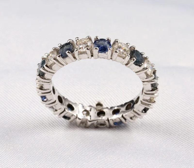 Alliance américaine en or blanc sertie à griffes alternant très beaux diamants et saphirs.