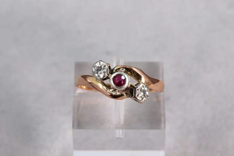 Bague en or rose proposant une version du toi et moi orné d’un rubis et de deux diamants taillés en rose. Cette bague ancienne de la Belle-Epoque constituerait une belle idée pour des fiançailles…