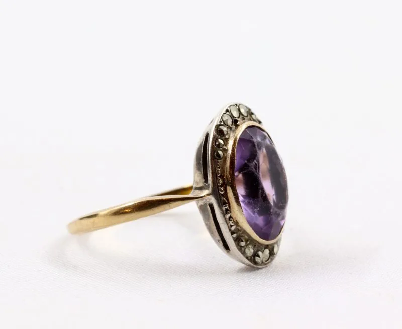 Très jolie bague ornée d’une améthyste ovale en serti clos or jaune, entourée de petites marcassites sur argent. L’anneau en or jaune. Travail français de la fin du XIXe siècle.