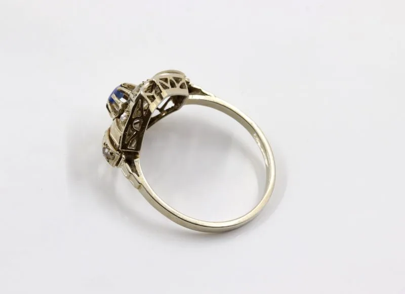 Bague géométrique Art déco datant des années 1925 à 1930 composée d’un motif octogonal en or blanc sertie de diamant taillé en rose et d’un petit saphir facetté au centre. La modernité de l’Art déco, la légèreté d’une bague à porter au quotidien.