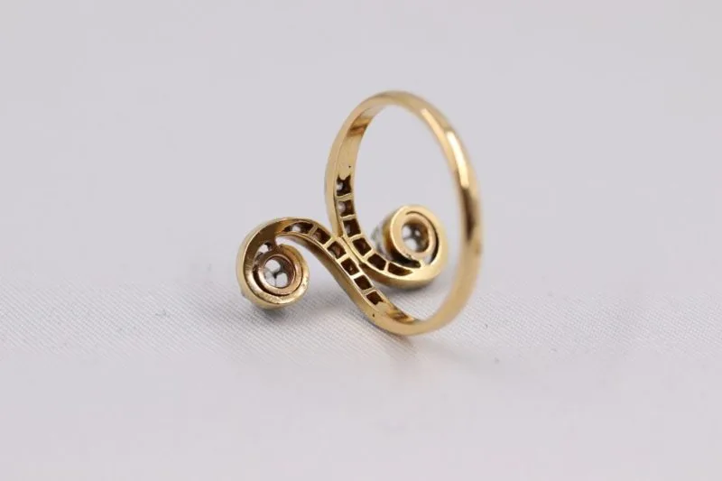 Bague de fiançailles dite « toi & moi » en or jaune et gris 750‰ (18 kt) serti de deux diamants taille ancienne se se faisant face dans un motif de S romantique, typique de la Belle époque. Les entrelacs eux-mêmes sont sertis de petits diamants taillés en rose.