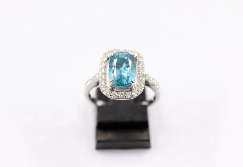 Bague contemporaine sertie d’un superbe zircon bleu naturel enchâssé dans un très joli panier ouvragé et mis en valeur par un entourage de diamants de taille moderne.