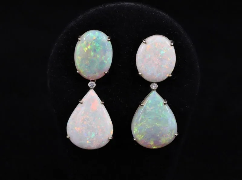 Très belles opales d’Australie dans les tons pastels de vert et de roses montées en boucles d’oreilles pendantes sur or blanc 750‰ (18 kt) avec petit brillant intercalaire. Les couleurs sont inversées sur chaque boucle pour plus d’originalité. La partie inférieure est mobile.
