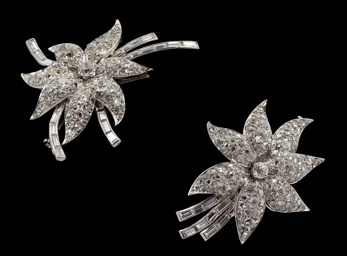 Superbe broche des années 1920 représentant deux fleurs d’edelweiss constellées de diamants de taille ancienne. Possibilité de séparer les deux clips pour un porté différent.