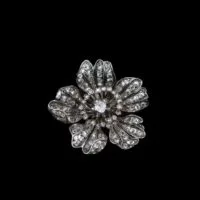 Broche en or 750‰ (18 kt) et argent en forme de fleur d’églantier entièrement sertie de diamants taille ancienne et de diamants tailles roses. Motif caractéristique du Second Empire.