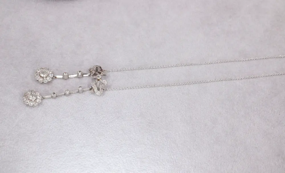 Nous vous présentons un bijou d’exception avec ce superbe négligé de la toute fin du XIXe siècle. Sa chaîne fine maintient un noeud aux rubans mouvementés agrémentés de diamants taillés en rose dont deux tiges d’or lisse de tailles inégales ponctuées de diamants sertis clos maintiennent deux motifs floraux entièrement sertis de diamants. Chaque fleur présente en son centre un diamant d’un demi carat environ entouré de dix diamants moins importants. Un sublime travail français pour retrouver l’élégance de la Belle Epoque.