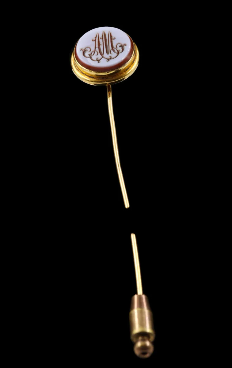 Elégante épingle à cravate en or et agate bicolore gravé des initiales A et M en lettres anglaises.