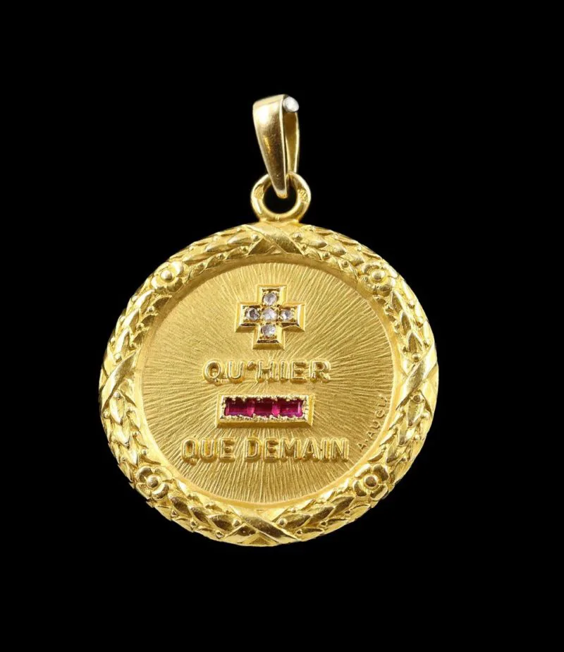 Grande médaille d’amour en or 750‰ (18 kt) réalisée par Alphonse Augis à partir de 1907. Le médaillon reprend deux vers d’un poème de Rosemonde Gérard que lui inspira son époux Edmond Rostand. Le + et le – sont en rubis synthétiques et diamants. La guirlande sur le pourtour de la médaille est caractéristique de ces productions lyonnaises. Le dos est resté libre pour accueillir la gravure de votre propre histoire…
