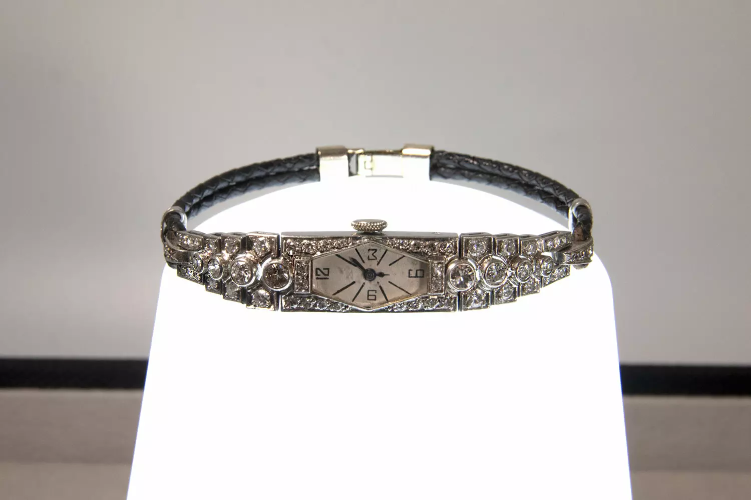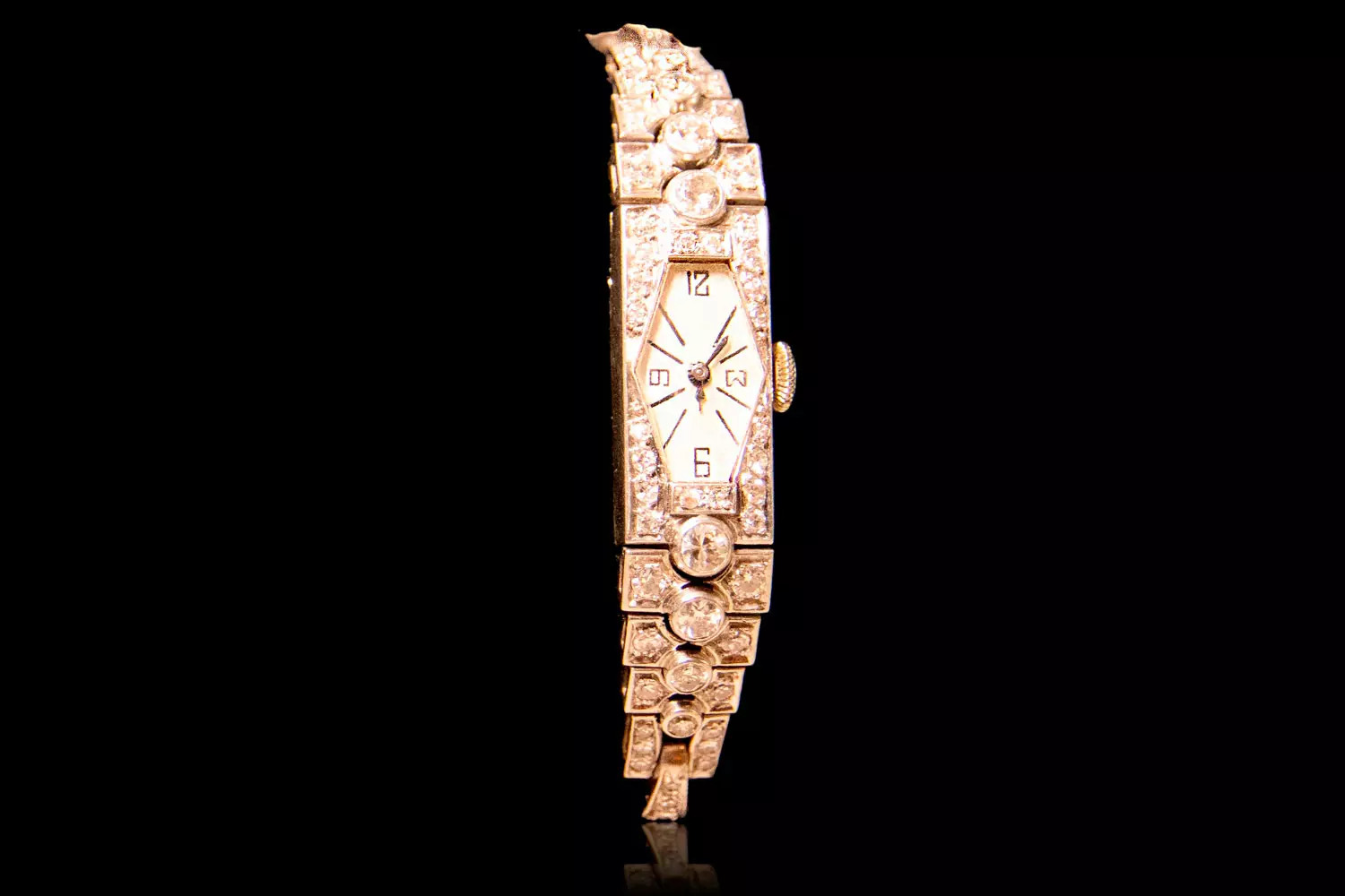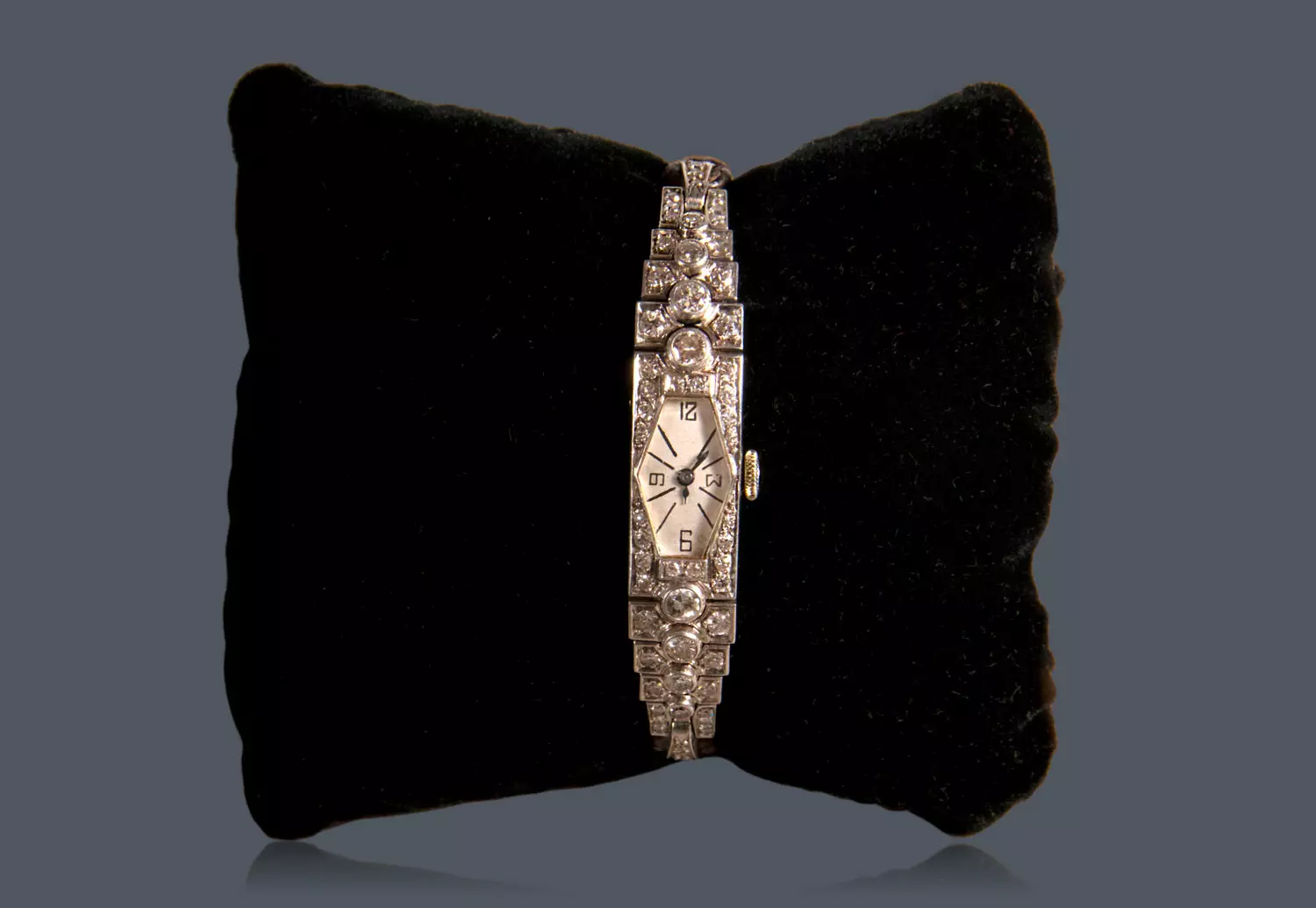 Cette montre-bracelet mécanique en platine des années 30 est ornée de nombreux diamants de différentes tailles en serti clos et en serti grains. Le bracelet en cuir tressé allège cette montre-bijou dont le fermoir est une boucle en or blanc pour un porté facilité au quotidien. Le cadran rectangulaire aux angles coupés compte parmi les constantes de ce style historique et indémodable qu’est l’Art Déco. A ce titre, cette montre est à la fois un instrument de mesure du temps, un bijou et une véritable pièce de collection à adopter sans plus tarder !
