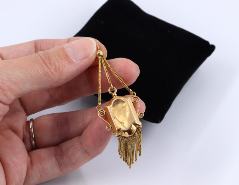 Pendentif Napoléon III en or, caractéristique avec ses franges en chute constituées de chaînes maille colonne pour un bijou en perpétuel mouvement, léger et précieux. Vendu seul ou accompagné de sa broche barrette en or.