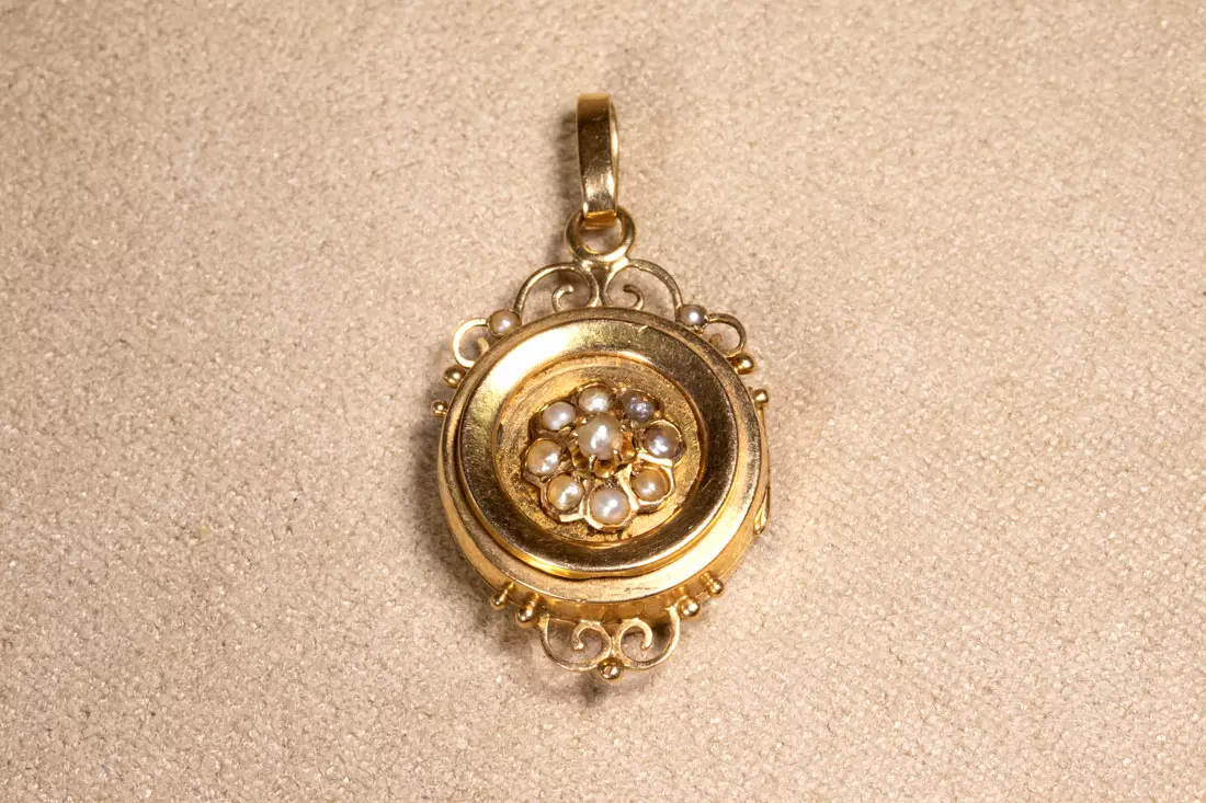 Délicat médaillon ouvrant de la fin du du XIXe siècle e, or jaune ornementé de perles fines et de volutes, ce pendentif vous permettra d’insérer le petit objet de votre choix dans le compartiment doté d’un verre du bijou.
